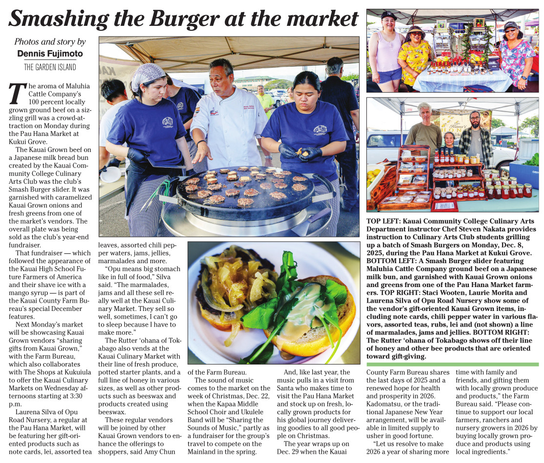Big Mahalo to Dennis Fujimoto for his article in the Garden Islands News regarding the December Holiday Events at the Monday Pau Hana Market.