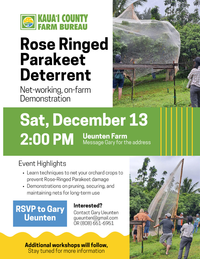 If you're able to lend a hand, please reach out to Gary at gueunten@gmail.com or 808-651-6951. Every bit of support helps, and we truly appreciate our members who step up to strengthen our community. Please also see the attached flyer for event details. Mahalo nui loa for your continued support of Kauai County Farm Bureau! |